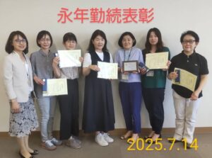 寺澤理事長の1学期の振り返りに続き、10年以上勤務のスタッフに永年勤続表彰状と記念品が贈られました。