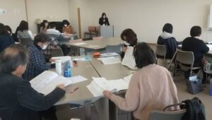 寺澤理事長の2学期の振り返りに続いて、鈴木日本語コーディネーターよりはまっこテキスト改訂新版の紹介があり、会員たちは一つずつ改訂個所の確認をしていました。