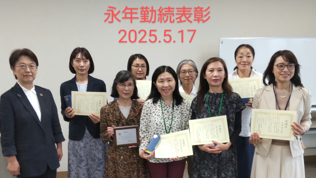 次に、今年から始まったスタッフの永年勤続表彰が行われ、10年以上勤務で当日出席の8名に表彰状と記念品が手渡されました。